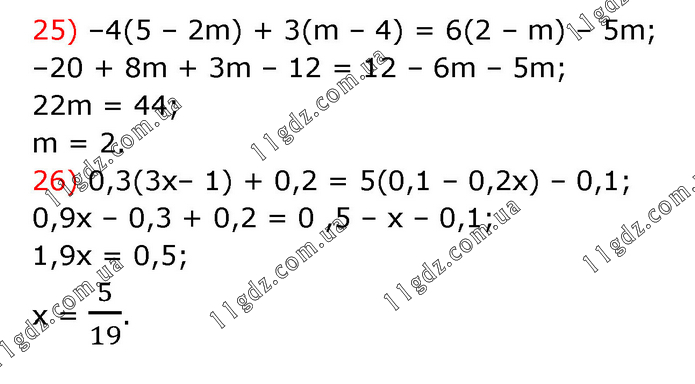 25) –4(5 – 2m) + 3(m – 4) = 6(2 – m) – 5m; –20 + 8m + 3m – 12 = 12 – 6m – 5m; 22m = 44; m = 2. 26) 0,3(3х– 1) + 0,2 = 5(0,1 – 0,2х) – 0,1; 0,9х – 0,3 + 0,2 = 0 ,5 – х – 0,1; 1,9х = 0,5; x = 5/19.