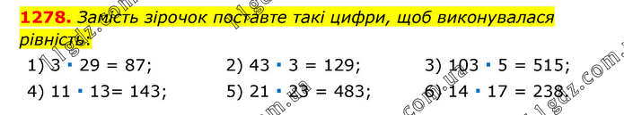 Замість зірочок поставте такі цифри, щоб виконувалася рівність: 1) 3 ∙ 29 = 87; 2) 43 ∙ 3 = 129; 3) 103 ∙ 5 = 515; 4) 11 ∙ 13= 143; 5) 21 ∙ 23 = 483; 6) 14 ∙ 17 = 238.