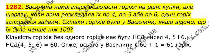 Василина намагалася розкласти горіхи на рівні купки, але щоразу, коли вона розкладала їх по 4, по 5 або по 6, один горіх залишався зайвим. Скільки горіхів було у Василини, якщо відомо, що їх було менше ніж 100? Кількість горіхів без одного горіха має бути НСД чисел 4, 5 і 6. НСД(4; 5; 6) = 60. Отже, всього у Василини є 60 + 1 = 61 горіх.