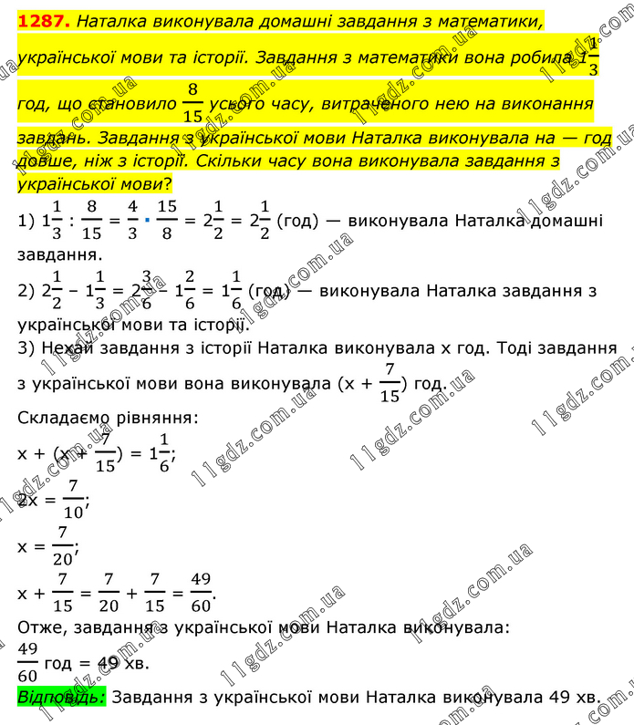 Наталка виконувала домашні завдання з математики, української мови та історії. Завдання з математики вона робила 11/3 год, що становило 8/15 усього часу, витраченого нею на виконання завдань. Завдання з української мови Наталка виконувала на — год довше, ніж з історії. Скільки часу вона виконувала завдання з української мови? 1) 11/3 : 8/15 = 4/3 ∙ 15/8 = 21/2 = 21/2 (год) — виконувала Наталка домашні завдання. 2) 21/2 – 11/3 = 23/6 – 12/6 = 11/6 (год) — виконувала Наталка завдання з української мови та історії. 3) Нехай завдання з історії Наталка виконувала х год. Тоді завдання з української мови вона виконувала (х + 7/15) год. Складаємо рівняння: х + (х + 7/15) = 11/6; 2х = 7/10; х = 7/20; х + 7/15 = 7/20 + 7/15 = 49/60. Отже, завдання з української мови Наталка виконувала: 49/60 год = 49 хв. Відповідь: Завдання з української мови Наталка виконувала 49 хв.