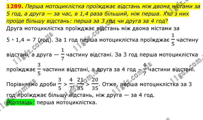 Перша мотоциклістка проїжджає відстань між двома містами за 5 год, а друга — за час, в 1,4 раза більший, ніж перша. Хто з них проїде більшу відстань: перша за 3 год чи друга за 4 год? Друга мотоциклістка проїжджає відстань між двома містами за 5 ∙ 1,4 = 7 (год). За 1 год перша мотоциклістка проїжджає 1/5 частину відстані, а друга — 1/7 частину відстані. За 3 год перша мотоциклістка проїжджає 3/5 частини відстані, а друга за 4 год – 4/7 частини відстані. Порівняємо дроби 3/5 > 4/7; 21/35 > 20/35. Отже, перша мотоциклістка за 3 год проїжджає більшу відстань, ніж друга — за 4 год. Відповідь: перша мотоциклістка.