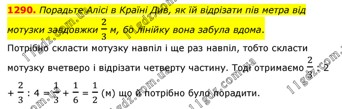 Порадьте Алісі в Країні Див, як їй відрізати пів метра від мотузки завдовжки 2/3 м, бо лінійку вона забула вдома. Потрібно скласти мотузку навпіл і ще раз навпіл, тобто скласти мотузку вчетверо і відрізати четверту частину. Тоді отримаємо 2/3 : 2 + 2/3 : 4 = 1/3 + 1/6 = 1/2 (м) що й потрібно було порадити.