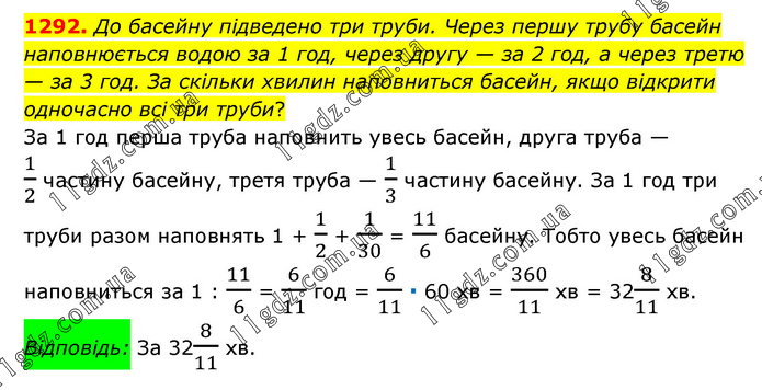 До басейну підведено три труби. Через першу трубу басейн наповнюється водою за 1 год, через другу — за 2 год, а через третю — за 3 год. За скільки хвилин наповниться басейн, якщо відкрити одночасно всі три труби? За 1 год перша труба наповнить увесь басейн, друга труба —1/2 частину басейну, третя труба — 1/3 частину басейну. За 1 год три труби разом наповнять 1 + 1/2 + 1/30 = 11/6 басейну. Тобто увесь басейн наповниться за 1 : 11/6 = 6/11 год = 6/11 ∙ 60 хв = 360/11 хв = 328/11 хв. Відповідь: За 328/11 хв.