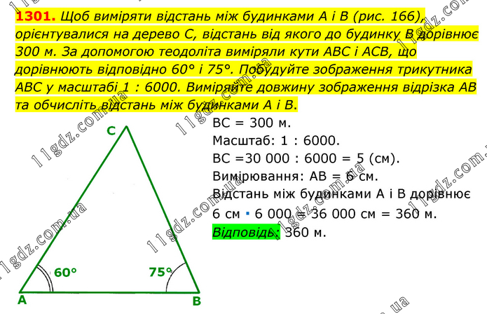 Щоб виміряти відстань між будинками A i B (рис. 166), орієнтувалися на дерево С, відстань від якого до будинку В дорівнює 300 м. За допомогою теодоліта виміряли кути ABC і АСВ, що дорівнюють відповідно 60° і 75°. Побудуйте зображення трикутника ABC у масштабі 1 : 6000. Виміряйте довжину зображення відрізка AB та обчисліть відстань між будинками А і В. ВС = 300 м. Масштаб: 1 : 6000. ВС =30 000 : 6000 = 5 (см). Вимірювання: AB = 6 см. Відстань між будинками А і В дорівнює 6 см ∙ 6 000 = 36 000 см = 360 м. Відповідь: 360 м.