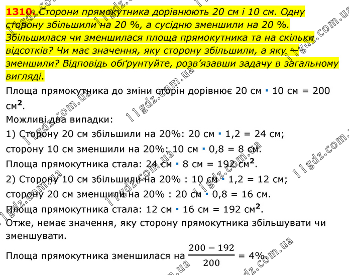 Сторони прямокутника дорівнюють 20 см і 10 см. Одну сторону збільшили на 20 %, а сусідню зменшили на 20 %. Збільшилася чи зменшилася площа прямокутника та на скільки відсотків? Чи має значення, яку сторону збільшили, а яку — зменшили? Відповідь обґрунтуйте, розв’язавши задачу в загальному вигляді. Площа прямокутника до зміни сторін дорівнює 20 см ∙ 10 см = 200 см2. Можливі два випадки: 1) Сторону 20 см збільшили на 20%: 20 см ∙ 1,2 = 24 см; сторону 10 см зменшили на 20%: 10 см ∙ 0,8 = 8 см. Площа прямокутника стала: 24 см ∙ 8 см = 192 см2. 2) Сторону 10 см збільшили на 20% : 10 см ∙ 1,2 = 12 см; сторону 20 см зменшили на 20% : 20 см ∙ 0,8 = 16 см. Площа прямокутника стала: 12 см ∙ 16 см = 192 см2. Отже, немає значення, яку сторону прямокутника збільшувати чи зменшувати. Площа прямокутника зменшилася на (200 - 192)/200 = 4%.