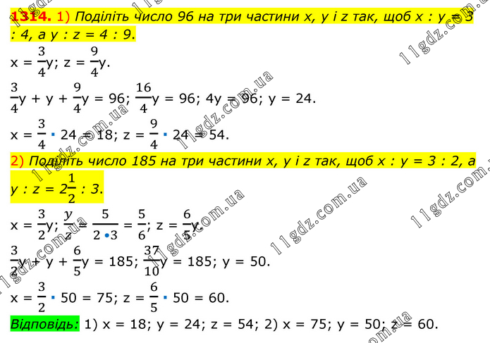 1) Поділіть число 96 на три частини х, у і z так, щоб х : у = 3 : 4, а у : z = 4 : 9. х = 3/4у; z = 9/4y. 3/4y + y + 9/4y = 96; 16/4y = 96; 4y = 96; y = 24. x = 3/4 ∙ 24 = 18; z = 9/4 ∙ 24 = 54. 2) Поділіть число 185 на три частини х, у і z так, щоб х : у = 3 : 2, а у : z = 21/2 : 3. x = 3/2y; y/z = 5/(2 •3) = 5/6; z = 6/5y. 3/2y + y + 6/5y = 185; 37/10y = 185; y = 50. x = 3/2 ∙ 50 = 75; z = 6/5 ∙ 50 = 60. Відповідь: 1) х = 18; у = 24; z = 54; 2) x = 75; y = 50; z = 60.