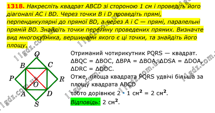 Накресліть квадрат ABCD зі стороною 1 см і проведіть його діагоналі AC і BD. Через точки В і D проведіть прямі, перпендикулярні до прямої BD, а через A i C — прямі, паралельні прямій BD. Знайдіть точки перетину проведених прямих. Визначте вид многокутника, вершинами якого є ці точки, та знайдіть його площу. Отриманий чотирикутник PQRS — квадрат. ∆ВQС = ∆ВОС, ∆ВРА = ∆BОА, ∆DSА = ∆DОА, ∆DRС = ∆DОС. Отже, площа квадрата РQRS удвічі більша за площу квадрата АВСD тобто дорівнює 2 ∙ 1 см2 = 2 см2. Відповідь: 2 см2.