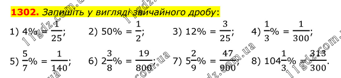 Запишіть у вигляді звичайного дробу: 1) 4% = 1/25; 2) 50% = 1/2; 3) 12% = 3/25; 4) 1/3% = 1/300; 5) 5/7% = 1/140; 6) 23/8% = 19/800; 7) 52/9% = 47/900; 8) 1041/3% = 313/300.