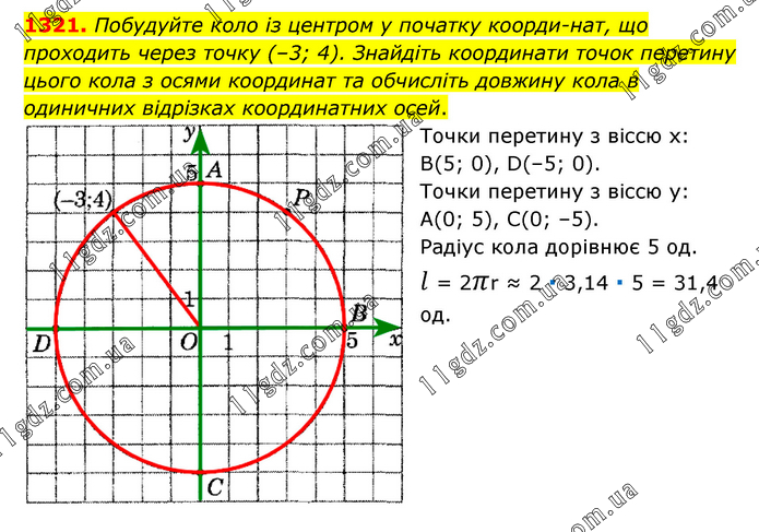 Побудуйте коло із центром у початку координат, що проходить через точку (–3; 4). Знайдіть координати точок перетину цього кола з осями координат та обчисліть довжину кола в одиничних відрізках координатних осей. Точки перетину з віссю х: В(5; 0), D(–5; 0). Точки перетину з віссю у: А(0; 5), С(0; –5). Радіус кола дорівнює 5 од. l = 2πr ≈ 2 ∙ 3,14 ∙ 5 = 31,4 од.