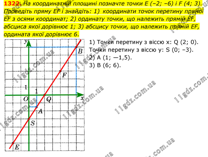 На координатній площині позначте точки E (–2; –6) і F (4; 3). Проведіть пряму EF і знайдіть: 1) координати точок перетину прямої EF з осями координат; 2) ординату точки, що належить прямій EF, абсциса якої дорівнює 1; 3) абсцису точки, що належить прямій EF, ордината якої дорівнює 6. 1) Точки перетину з віссю х: Q (2; 0). Точки перетину з віссю у: S (0; –3). 2) А (1; —1,5). 3) В (6; 6).