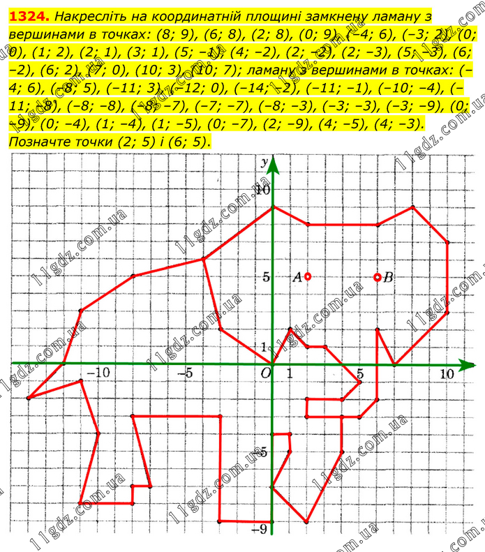 Накресліть на координатній площині замкнену ламану з вершинами в точках: (8; 9), (6; 8), (2; 8), (0; 9), (–4; 6), (–3; 2), (0; 0), (1; 2), (2; 1), (3; 1), (5; –1), (4; –2), (2; –2), (2; –3), (5; –3), (6; –2), (6; 2), (7; 0), (10; 3), (10; 7); ламану з вершинами в точках: (–4; 6), (–8; 5), (–11; 3), (–12; 0), (–14; –2), (–11; –1), (–10; –4), (–11; –8), (–8; –8), (–8; –7), (–7; –7), (–8; –3), (–3; –3), (–3; –9), (0; –9), (0; –4), (1; –4), (1; –5), (0; –7), (2; –9), (4; –5), (4; –3). Позначте точки (2; 5) і (6; 5).