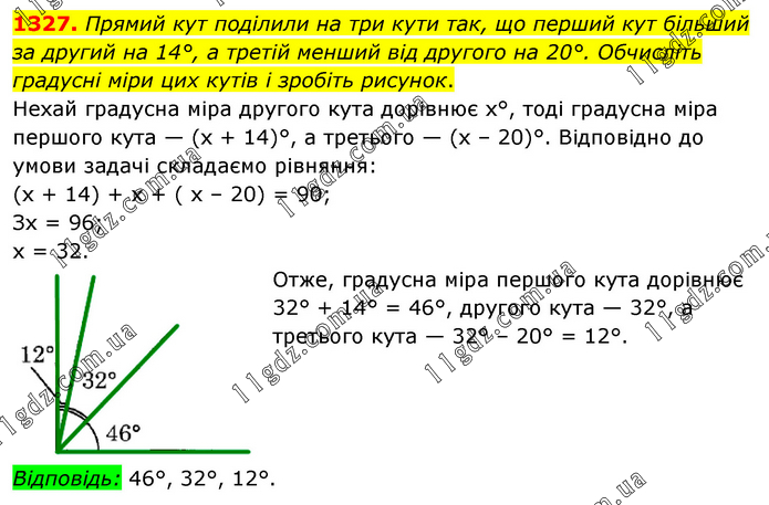 Прямий кут поділили на три кути так, що перший кут більший за другий на 14°, а третій менший від другого на 20°. Обчисліть градусні міри цих кутів і зробіть рисунок. Нехай градусна міра другого кута дорівнює х°, тоді градусна міра першого кута — (х + 14)°, а третього — (х – 20)°. Відповідно до умови задачі складаємо рівняння: (х + 14) + х + ( х – 20) = 90; Зх = 96; х = 32. Отже, градусна міра першого кута дорівнює 32° + 14° = 46°, другого кута — 32°, а третього кута — 32° – 20° = 12°. Відповідь: 46°, 32°, 12°.