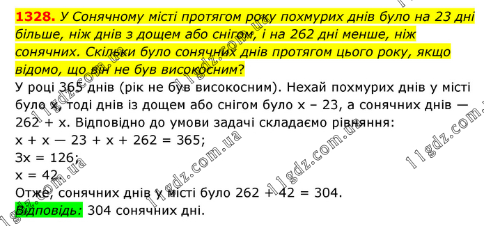 У Сонячному місті протягом року похмурих днів було на 23 дні більше, ніж днів з дощем або снігом, і на 262 дні менше, ніж сонячних. Скільки було сонячних днів протягом цього року, якщо відомо, що він не був високосним? У році 365 днів (рік не був високосним). Нехай похмурих днів у місті було х, тоді днів із дощем або снігом було х – 23, а сонячних днів — 262 + х. Відповідно до умови задачі складаємо рівняння: х + х — 23 + х + 262 = 365; Зх = 126; х = 42. Отже, сонячних днів у місті було 262 + 42 = 304. Відповідь: 304 сонячних дні.