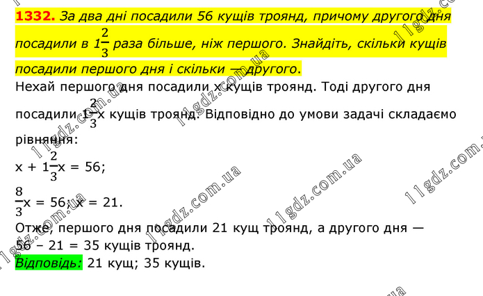 За два дні посадили 56 кущів троянд, причому другого дня посадили в 12/3 раза більше, ніж першого. Знайдіть, скільки кущів посадили першого дня і скільки — другого. Нехай першого дня посадили х кущів троянд. Тоді другого дня посадили 12/3х кущів троянд. Відповідно до умови задачі складаємо рівняння: х + 12/3х = 56; 8/3х = 56; х = 21. Отже, першого дня посадили 21 кущ троянд, а другого дня — 56 – 21 = 35 кущів троянд. Відповідь: 21 кущ; 35 кущів.