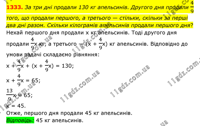 За три дні продали 130 кг апельсинів. Другого дня продали 4/9 того, що продали першого, а третього — стільки, скільки за перші два дні разом. Скільки кілограмів апельсинів продали першого дня? Нехай першого дня продали х кг апельсинів. Тоді другого дня продали 4/9х кг, а третього — (х + 4/9х) кг апельсинів. Відповідно до умови задачі складаємо рівняння: х + 4/9х + (х + 4/9х) = 130; х + 4/9х = 65; 13/9х = 65; х = 45. Отже, першого дня продали 45 кг апельсинів. Відповідь: 45 кг апельсинів.