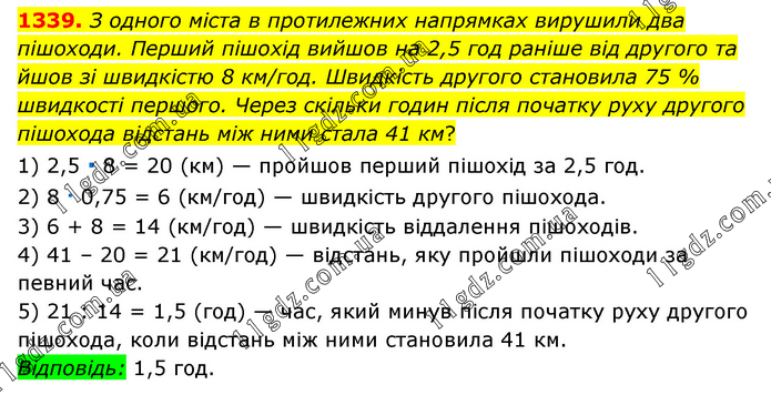 З одного міста в протилежних напрямках вирушили два пішоходи. Перший пішохід вийшов на 2,5 год раніше від другого та йшов зі швидкістю 8 км/год. Швидкість другого становила 75 % швидкості першого. Через скільки годин після початку руху другого пішохода відстань між ними стала 41 км? 1) 2,5 ∙ 8 = 20 (км) — пройшов перший пішохід за 2,5 год. 2) 8 ∙ 0,75 = 6 (км/год) — швидкість другого пішохода. 3) 6 + 8 = 14 (км/год) — швидкість віддалення пішоходів. 4) 41 – 20 = 21 (км/год) — відстань, яку пройшли пішоходи за певний час. 5) 21 : 14 = 1,5 (год) — час, який минув після початку руху другого пішохода, коли відстань між ними становила 41 км. Відповідь: 1,5 год.