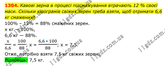 Кавові зерна в процесі підсмажування втрачають 12 % своєї маси. Скільки кілограмів свіжих зерен треба взяти, щоб отримати 6,6 кг смажених? 100% – 12% = 88% смажених зерен. х кг — 100%, 6,6 кг — 88%. х/6,6 = 100/88; х = (6,6 • 100)/88; х = 7,5. Отже, потрібно взяти 7,5 кг свіжих зерен. Відповідь: 7,5 кг.