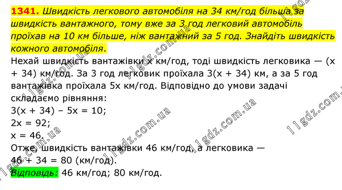 Швидкість легкового автомобіля на 34 км/год більша за швидкість вантажного, тому вже за 3 год легковий автомобіль проїхав на 10 км більше, ніж вантажний за 5 год. Знайдіть швидкість кожного автомобіля. Нехай швидкість вантажівки x км/год, тоді швидкість легковика — (x + 34) км/год. За 3 год легковик проїхала 3(х + 34) км, а за 5 год вантажівка проїхала 5x км/год. Відповідно до умови задачі складаємо рівняння: 3(x + 34) – 5x = 10; 2x = 92; х = 46. Отже, швидкість вантажівки 46 км/год, а легковика — 46 + 34 = 80 (км/год). Відповідь: 46 км/год; 80 км/год.