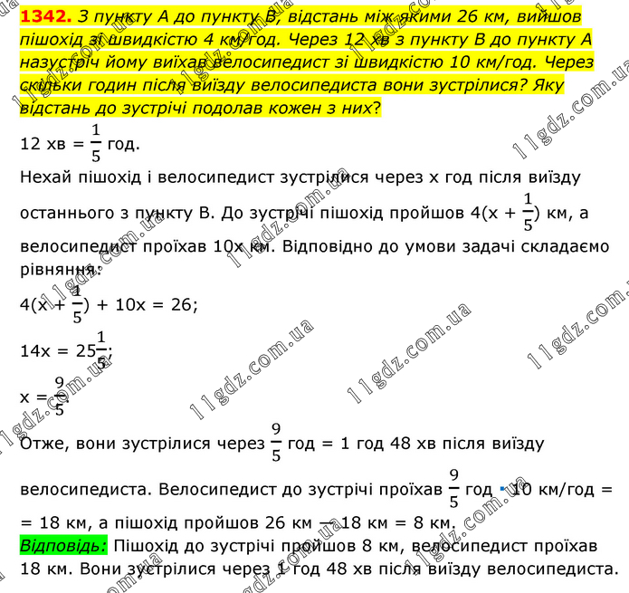 З пункту А до пункту В, відстань між якими 26 км, вийшов пішохід зі швидкістю 4 км/год. Через 12 хв з пункту В до пункту А назустріч йому виїхав велосипедист зі швидкістю 10 км/год. Через скільки годин після виїзду велосипедиста вони зустрілися? Яку відстань до зустрічі подолав кожен з них? 12 хв = 1/5 год. Нехай пішохід і велосипедист зустрілися через x год після виїзду останнього з пункту В. До зустрічі пішохід пройшов 4(х + 1/5) км, а велосипедист проїхав 10x км. Відповідно до умови задачі складаємо рівняння: 4(x + 1/5) + 10x = 26; 14х = 251/5; х = 9/5. Отже, вони зустрілися через 9/5 год = 1 год 48 хв після виїзду велосипедиста. Велосипедист до зустрічі проїхав 9/5 год ∙ 10 км/год = = 18 км, а пішохід пройшов 26 км — 18 км = 8 км. Відповідь: Пішохід до зустрічі пройшов 8 км, велосипедист проїхав 18 км. Вони зустрілися через 1 год 48 хв після виїзду велосипедиста.