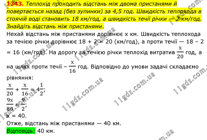 Теплохід проходить відстань між двома пристанями й повертається назад (без зупинки) за 4,5 год. Швидкість теплохода в стоячій воді становить 18 км/год, а швидкість течії річки — 2 км/год. Знайдіть відстань між пристанями. Нехай відстань між пристанями дорівнює х км. Швидкість теплохода за течією річки дорівнює 18 + 2 = 20 (км/год), а проти течії — 18 – 2 = 16 (км/год). На дорогу за течією річки теплохід витратив х/20 год, а на шлях проти течії – х/16 год. Відповідно до умови задачі складаємо рівняння: х/20 + х/16 = 41/2; 9х/80 = 9/2; х = 40. Отже, відстань між пристанями — 40 км. Відповідь: 40 км.