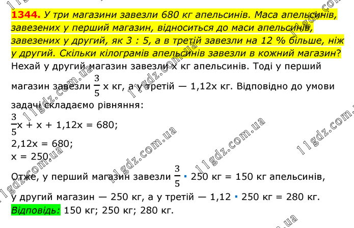 У три магазини завезли 680 кг апельсинів. Маса апельсинів, завезених у перший магазин, відноситься до маси апельсинів, завезених у другий, як 3 : 5, а в третій завезли на 12 % більше, ніж у другий. Скільки кілограмів апельсинів завезли в кожний магазин? Нехай у другий магазин завезли х кг апельсинів. Тоді у перший магазин завезли 3/5 х кг, а у третій — 1,12х кг. Відповідно до умови задачі складаємо рівняння: 3/5х + х + 1,12х = 680; 2,12х = 680; х = 250. Отже, у перший магазин завезли 3/5 ∙ 250 кг = 150 кг апельсинів, у другий магазин — 250 кг, а у третій — 1,12 ∙ 250 кг = 280 кг. Відповідь: 150 кг; 250 кг; 280 кг.