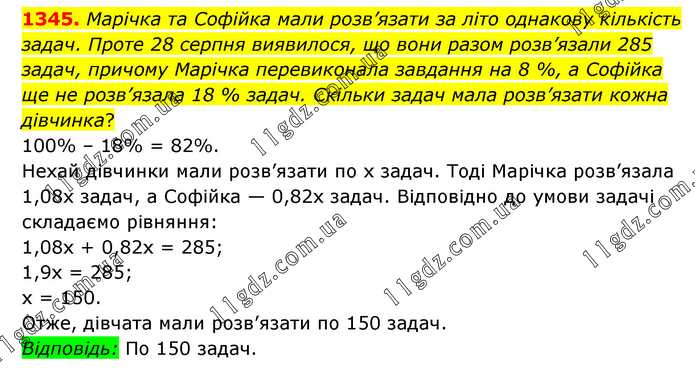 Марічка та Софійка мали розв’язати за літо однакову кількість задач. Проте 28 серпня виявилося, що вони разом розв’язали 285 задач, причому Марічка перевиконала завдання на 8 %, а Софійка ще не розв’язала 18 % задач. Скільки задач мала розв’язати кожна дівчинка? 100% – 18% = 82%. Нехай дівчинки мали розв’язати по х задач. Тоді Марічка розв’язала 1,08х задач, а Софійка — 0,82х задач. Відповідно до умови задачі складаємо рівняння: 1,08х + 0,82х = 285; 1,9х = 285; х = 150. Отже, дівчата мали розв’язати по 150 задач. Відповідь: По 150 задач.