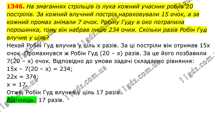 На змаганнях стрільців із лука кожний учасник робив 20 пострілів. За кожний влучний постріл нараховували 15 очок, а за кожний промах знімали 7 очок. Робіну Гуду в око потрапила порошинка, тому він набрав лише 234 очки. Скільки разів Робін Гуд влучив у ціль? Нехай Робін Гуд влучив у ціль х разів. За ці постріли він отримав 15х очок. Промахнувся ж Робін Гуд (20 – х) разів. За це його позбавили 7(20 – х) очок. Відповідно до умови задачі складаємо рівняння: 15х – 7(20 – х) = 234; 22х = 374; х = 17. Отже, Робін Гуд влучив у ціль 17 разів. Відповідь: 17 разів.