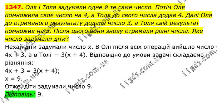Оля і Толя задумали одне й те саме число. Потім Оля помножила своє число на 4, а Толя до свого числа додав 4. Далі Оля до отриманого результату додала число 3, а Толя свій результат помножив на 3. Після цього вони знову отримали рівні числа. Яке число задумали діти? Нехай діти задумали число х. В Олі після всіх операцій вийшло число 4х + 3, а в Толі — 3(х + 4). Відповідно до умови задачі складаємо рівняння: 4х + 3 = 3(х + 4); х = 9. Отже, діти задумали число 9. Відповідь: 9.