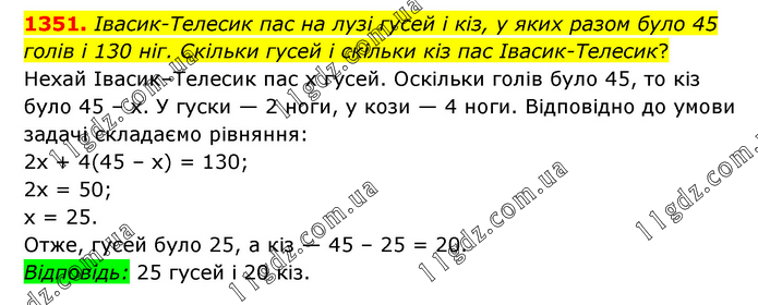 Івасик-Телесик пас на лузі гусей і кіз, у яких разом було 45 голів і 130 ніг. Скільки гусей і скільки кіз пас Івасик-Телесик? Нехай Івасик–Телесик пас х гусей. Оскільки голів було 45, то кіз було 45 – х. У гуски — 2 ноги, у кози — 4 ноги. Відповідно до умови задачі складаємо рівняння: 2х + 4(45 – х) = 130; 2х = 50; х = 25. Отже, гусей було 25, а кіз — 45 – 25 = 20. Відповідь: 25 гусей і 20 кіз.