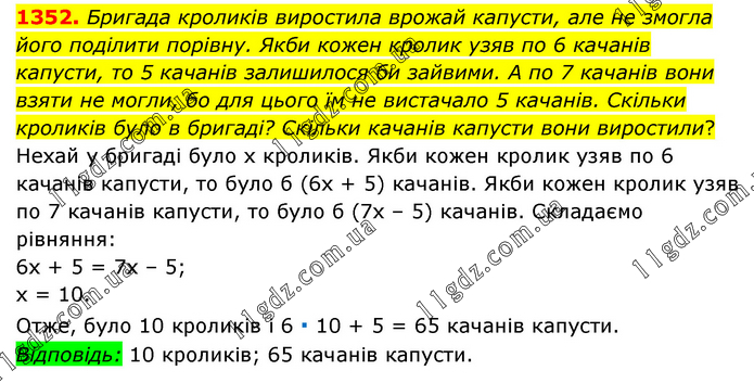 Бригада кроликів виростила врожай капусти, але не змогла його поділити порівну. Якби кожен кролик узяв по 6 качанів капусти, то 5 качанів залишилося би зайвими. А по 7 качанів вони взяти не могли, бо для цього їм не вистачало 5 качанів. Скільки кроликів було в бригаді? Скільки качанів капусти вони виростили? Нехай у бригаді було х кроликів. Якби кожен кролик узяв по 6 качанів капусти, то було б (6х + 5) качанів. Якби кожен кролик узяв по 7 качанів капусти, то було б (7х – 5) качанів. Складаємо рівняння: 6х + 5 = 7х – 5; х = 10. Отже, було 10 кроликів і 6 ∙ 10 + 5 = 65 качанів капусти. Відповідь: 10 кроликів; 65 качанів капусти.