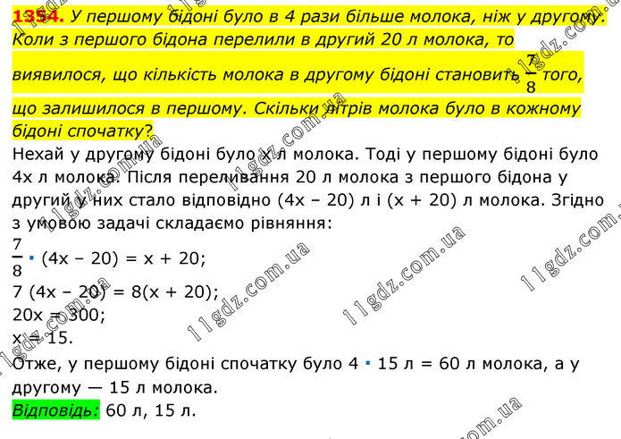 У першому бідоні було в 4 рази більше молока, ніж у другому. Коли з першого бідона перелили в другий 20 л молока, то виявилося, що кількість молока в другому бідоні становить 7/8 того, що залишилося в першому. Скільки літрів молока було в кожному бідоні спочатку? Нехай у другому бідоні було х л молока. Тоді у першому бідоні було 4х л молока. Після переливання 20 л молока з першого бідона у другий у них стало відповідно (4х – 20) л і (х + 20) л молока. Згідно з умовою задачі складаємо рівняння: 7/8 ∙ (4х – 20) = х + 20; 7 (4х – 20) = 8(х + 20); 20х = 300; х = 15. Отже, у першому бідоні спочатку було 4 ∙ 15 л = 60 л молока, а у другому — 15 л молока. Відповідь: 60 л, 15 л.