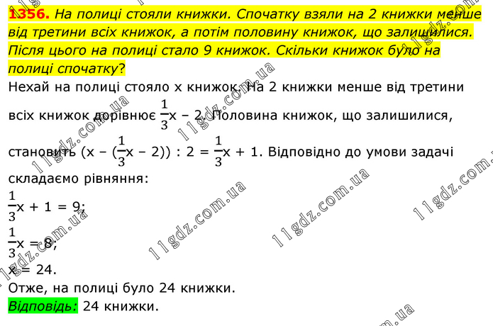 На полиці стояли книжки. Спочатку взяли на 2 книжки менше від третини всіх книжок, а потім половину книжок, що залишилися. Після цього на полиці стало 9 книжок. Скільки книжок було на полиці спочатку? Нехай на полиці стояло х книжок. На 2 книжки менше від третини всіх книжок дорівнює 1/3х – 2. Половина книжок, що залишилися, становить (х – (1/3х – 2)) : 2 = 1/3х + 1. Відповідно до умови задачі складаємо рівняння: 1/3х + 1 = 9; 1/3х = 8; х = 24. Отже, на полиці було 24 книжки. Відповідь: 24 книжки.