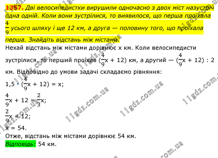 Дві велосипедистки вирушили одночасно з двох міст назустріч одна одній. Коли вони зустрілися, то виявилося, що перша проїхала 4/9 усього шляху і ще 12 км, а друга — половину того, що проїхала перша. Знайдіть відстань між містами. Нехай відстань між містами дорівнює х км. Коли велосипедисти зустрілися, то перший проїхав (4/9х + 12) км, а другий — (4/9х + 12) : 2 км. Відповідно до умови задачі складаємо рівняння: 1,5 ∙ (4/9х + 12) = х; 4/9х + 12 = 2/3х; 2/9х = 12; х = 54. Отже, відстань між містами дорівнює 54 км. Відповідь: 54 км.