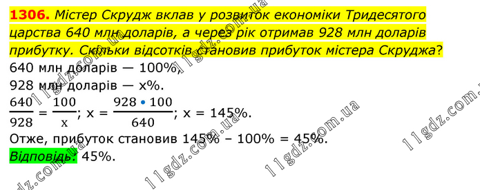 Містер Скрудж вклав у розвиток економіки Тридесятого царства 640 млн доларів, а через рік отримав 928 млн доларів прибутку. Скільки відсотків становив прибуток містера Скруджа? 640 млн доларів — 100%, 928 млн доларів — х%. 640/928 = 100/х; х = (928 • 100)/640; х = 145%. Отже, прибуток становив 145% – 100% = 45%. Відповідь: 45%.