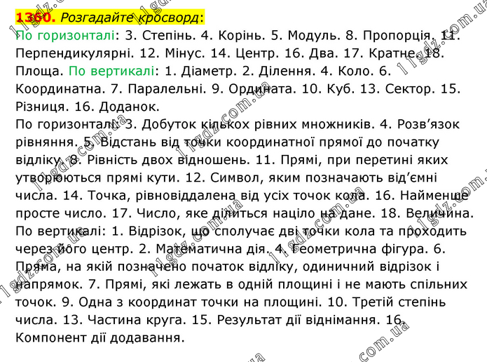 Розгадайте кросворд: По горизонталі: 3. Степінь. 4. Корінь. 5. Модуль. 8. Пропорція. 11. Перпендикулярні. 12. Мінус. 14. Центр. 16. Два. 17. Кратне. 18. Площа. По вертикалі: 1. Діаметр. 2. Ділення. 4. Коло. 6. Координатна. 7. Паралельні. 9. Ордината. 10. Куб. 13. Сектор. 15. Різниця. 16. Доданок. По горизонталі: 3. Добуток кількох рівних множників. 4. Розв’язок рівняння. 5. Відстань від точки координатної прямої до початку відліку. 8. Рівність двох відношень. 11. Прямі, при перетині яких утворюються прямі кути. 12. Символ, яким позначають від’ємні числа. 14. Точка, рівновіддалена від усіх точок кола. 16. Найменше просте число. 17. Число, яке ділиться націло на дане. 18. Величина. По вертикалі: 1. Відрізок, що сполучає дві точки кола та проходить через його центр. 2. Математична дія. 4. Геометрична фігура. 6. Пряма, на якій позначено початок відліку, одиничний відрізок і напрямок. 7. Прямі, які лежать в одній площині і не мають спільних точок. 9. Одна з координат точки на площині. 10. Третій степінь числа. 13. Частина круга. 15. Результат дії віднімання. 16. Компонент дії додавання.