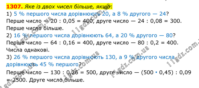 Яке із двох чисел більше, якщо: 1) 5 % першого числа дорівнюють 20, а 8 % другого — 24? Перше число — 20 : 0,05 = 400, друге число — 24 : 0,08 = 300. Перше число більше. 2) 16 % першого числа дорівнюють 64, а 20 % другого — 80? Перше число — 64 : 0,16 = 400, друге число — 80 : 0,2 = 400. Числа однакові. 3) 26 % першого числа дорівнюють 130, а 9 % другого числа дорівнюють 45 % першого? Перше число — 130 : 0,26 = 500, друге число — (500 ∙ 0,45) : 0,09 = 2500. Друге число більше.
