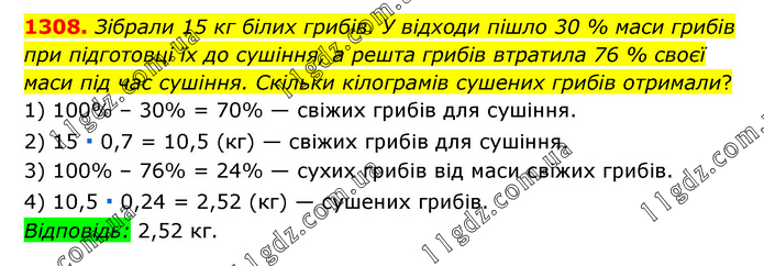 Зібрали 15 кг білих грибів. У відходи пішло 30 % маси грибів при підготовці їх до сушіння, а решта грибів втратила 76 % своєї маси під час сушіння. Скільки кілограмів сушених грибів отримали? 1) 100% – 30% = 70% — свіжих грибів для сушіння. 2) 15 ∙ 0,7 = 10,5 (кг) — свіжих грибів для сушіння. 3) 100% – 76% = 24% — сухих грибів від маси свіжих грибів. 4) 10,5 ∙ 0,24 = 2,52 (кг) — сушених грибів. Відповідь: 2,52 кг.