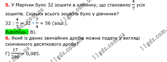 5. У Марічки було 32 зошити в клітинку, що становило 4/7 усіх зошитів. Скільки всього зошитів було у дівчинки? 32 : 4/7 = 32 ∙ 7/4 = 56 (зош.). Відповідь: В). 6. Який із даних звичайних дробів можна подати у вигляді скінченного десяткового дробу? Г) 17/200 = 0,085.