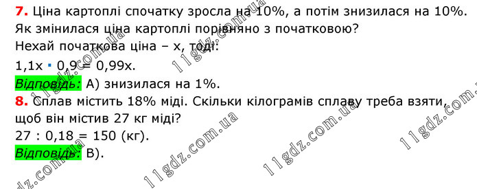 7. Ціна картоплі спочатку зросла на 10%, а потім знизилася на 10%. Як змінилася ціна картоплі порівняно з початковою? Нехай початкова ціна – х, тоді: 1,1х ∙ 0,9 = 0,99х. Відповідь: А) знизилася на 1%. 8. Сплав містить 18% міді. Скільки кілограмів сплаву треба взяти, щоб він містив 27 кг міді? 27 : 0,18 = 150 (кг). Відповідь: В).