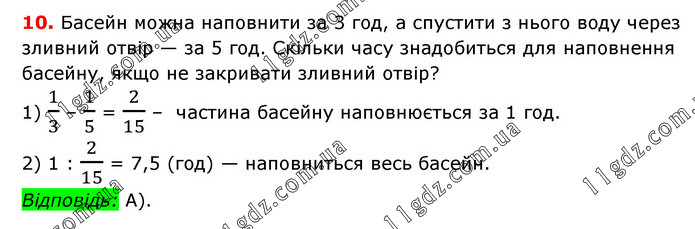 Басейн можна наповнити за 3 год, а спустити з нього воду через зливний отвір — за 5 год. Скільки часу знадобиться для наповнення басейну, якщо не закривати зливний отвір? 1) 1/3 – 1/5 = 2/15 – частина басейну наповнюється за 1 год. 2) 1 : 2/15 = 7,5 (год) — наповниться весь басейн. Відповідь: А).
