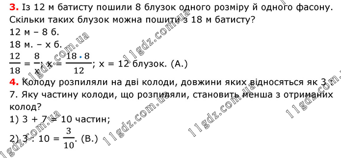3. Із 12 м батисту пошили 8 блузок одного розміру й одного фасону. Скільки таких блузок можна пошити з 18 м батисту? 12 м – 8 б. 18 м. – х б. 12/18 = 8/х; х = (18 • 8 )/12; х = 12 блузок. (А.) 4. Колоду розпиляли на дві колоди, довжини яких відносяться як 3 : 7. Яку частину колоди, що розпиляли, становить менша з отриманих колод? 1) 3 + 7 = 10 частин; 2) 3 : 10 = 3/10. (В.)