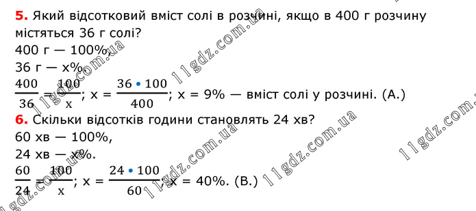 5. Який відсотковий вміст солі в розчині, якщо в 400 г розчину містяться 36 г солі? 400 г — 100%, 36 г — х%. 400/36 = 100/х; х = (36 • 100)/400; х = 9% — вміст солі у розчині. (А.) 6. Скільки відсотків години становлять 24 хв? 60 хв — 100%, 24 хв — х%. 60/24 = 100/х; х = (24 • 100)/60; х = 40%. (В.)