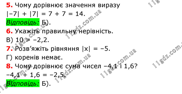 5. Чому дорівнює значення виразу |–7| + |7| = 7 + 7 = 14. Відповідь: Б). 6. Укажіть правильну нерівність. В) 10 > –2,2. 7. Розв’яжіть рівняння |х| = –5. Г) коренів немає. 8. Чому дорівнює сума чисел –4,1 і 1,6? –4,1 + 1,6 = –2,5. Відповідь: Б).
