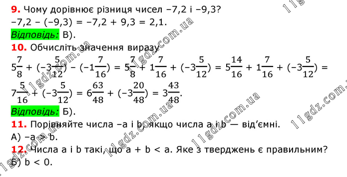 9. Чому дорівнює різниця чисел –7,2 і –9,3? –7,2 – (–9,3) = –7,2 + 9,3 = 2,1. Відповідь: В). 10. Обчисліть значення виразу 57/8 + (–35/12) – (–17/16) = 57/8 + 17/16 + (–35/12) = 514/16 + 17/16 + (–35/12) = 75/16 + (–35/12) = 663/48 + (–320/48) = 343/48. Відповідь: Б). 11. Порівняйте числа –а і b, якщо числа а і b — від’ємні. А) –а > b. 12. Числа а і b такі, що а + b < а. Яке з тверджень є правильним? Б) b < 0.