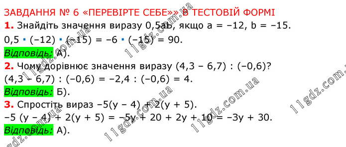 ЗАВДАННЯ № 6 «ПЕРЕВІРТЕ СЕБЕ»» В ТЕСТОВІЙ ФОРМІ 1. Знайдіть значення виразу 0,5аЬ, якщо а = –12, b = –15. 0,5 ∙ (–12) ∙ (–15) = –6 ∙ (–15) = 90. Відповідь: А). 2. Чому дорівнює значення виразу (4,3 – 6,7) : (–0,6)? (4,3 – 6,7) : (–0,6) = –2,4 : (–0,6) = 4. Відповідь: Б). 3. Спростіть вираз –5(у – 4) + 2(у + 5). –5 (у – 4) + 2(у + 5) = –5у + 20 + 2у + 10 = –Зу + 30. Відповідь: А).