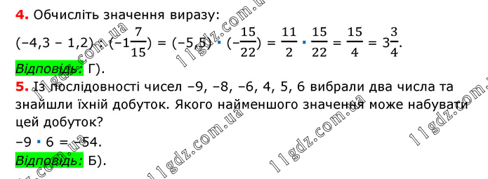 4. Обчисліть значення виразу: (–4,3 – 1,2) : (–17/15) = (–5,5) ∙ (–15/22) = 11/2 ∙ 15/22 = 15/4 = 33/4. Відповідь: Г). 5. Із послідовності чисел –9, –8, –6, 4, 5, 6 вибрали два числа та знайшли їхній добуток. Якого найменшого значення може набувати цей добуток? –9 ∙ 6 = –54. Відповідь: Б).