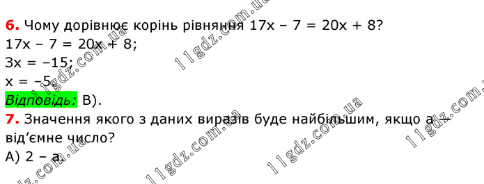 6. Чому дорівнює корінь рівняння 17х – 7 = 20х + 8? 17х – 7 = 20х + 8; Зх = –15; х = –5. Відповідь: В). 7. Значення якого з даних виразів буде найбільшим, якщо а — від’ємне число? А) 2 – а.