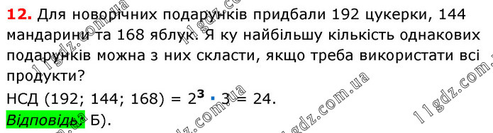 Для новорічних подарунків придбали 192 цукерки, 144 мандарини та 168 яблук. Я ку найбільшу кількість однакових подарунків можна з них скласти, якщо треба використати всі продукти? НСД (192; 144; 168) = 23 ∙ 3 = 24. Відповідь: Б).