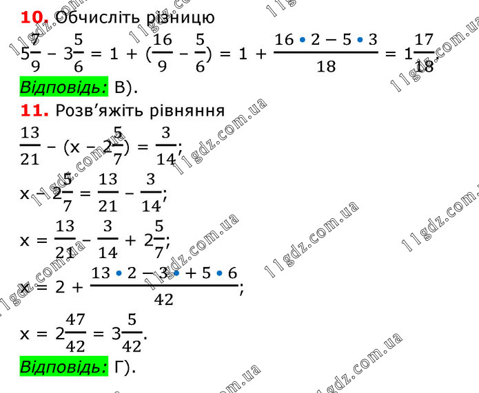 10. Обчисліть різницю 57/9 – 35/6 = 1 + (16/9 – 5/6) = 1 + (16 • 2 - 5 • 3)/18 = 117/18. Відповідь: В). 11. Розв’яжіть рівняння 13/21 – (х – 25/7) = 3/14; х – 25/7 = 13/21 – 3/14; х = 13/21 – 3/14 + 25/7; х = 2 + (13 • 2 - 3 • + 5 • 6)/42; х = 247/42 = 35/42. Відповідь: Г).