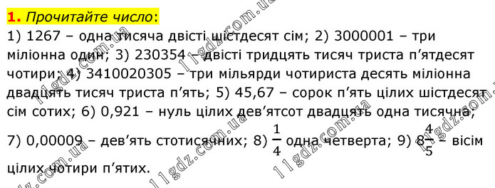 Прочитайте число: 1) 1267 – одна тисяча двісті шістдесят сім; 2) 3000001 – три міліонна один; 3) 230354 – двісті тридцять тисяч триста п’ятдесят чотири; 4) 3410020305 – три мільярди чотириста десять міліонна двадцять тисяч триста п’ять; 5) 45,67 – сорок п’ять цілих шістдесят сім сотих; 6) 0,921 – нуль цілих дев’ятсот двадцять одна тисячна; 7) 0,00009 – дев’ять стотисячних; 8) 1/4 одна четверта; 9) 84/5 – вісім цілих чотири п’ятих.